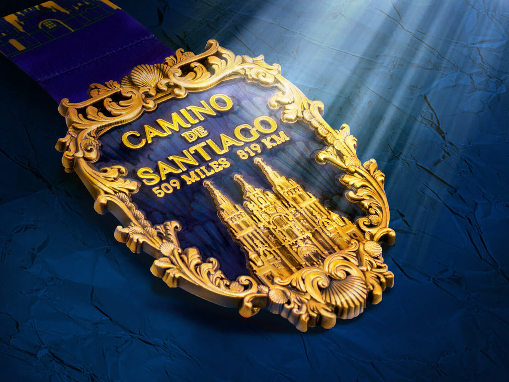 Esta medalla tiene una paleta de colores con tonos dorados y azules únicamente, con la excepción del color amarillo en la tipografía con serifa de la leyenda "Camino de Santiago", pero este tono es muy similar al dorado por lo que visualmente no representa un cambio drástico.